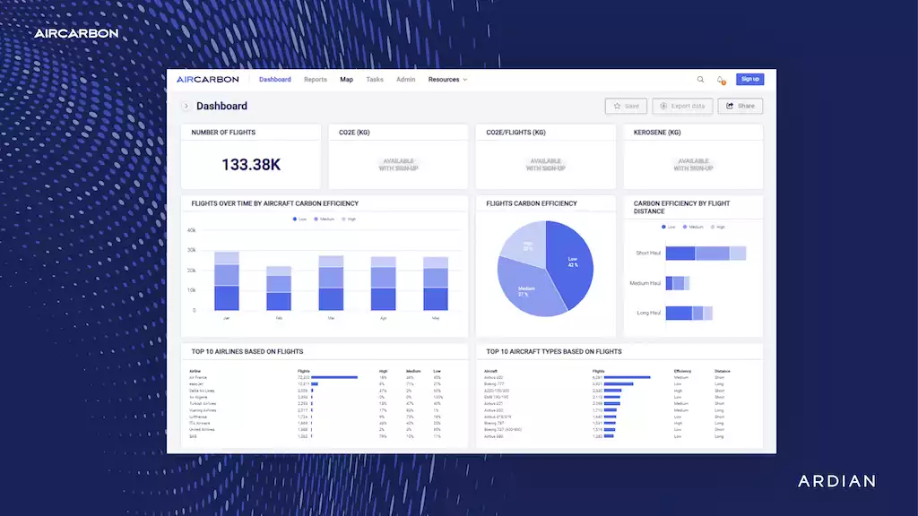 La platforme numérique AirCarbon développée par les équipes d'Ardian donne accès aux émissions carbone quotidiennes moyennes par pays et à des indicateurs d’efficacité carburant des avions pour la plupart des aéroports commerciaux dans le monde.