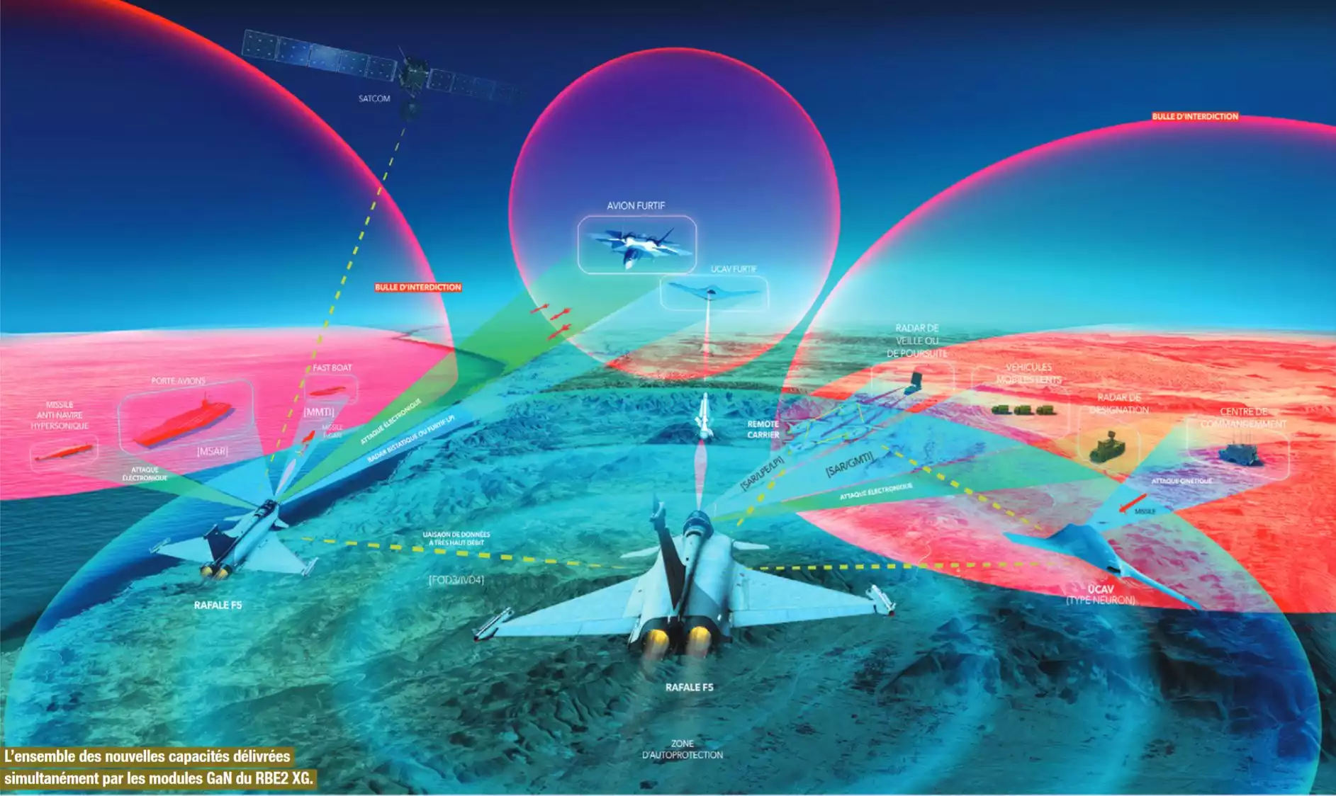 Ce radar serait non seulement doté de nouveaux T/R modules au nitrure de gallium mais aussi d'une nouvelle architecture numérique qui lui permettrait de décupler ses performances et de devenir un véritable senseur/effecteur multifonction. Plusieurs sources d'information nous permettent d'avoir une idée plus précise des capacités qu'apporterait le RBE-2 XG au Rafale F5.