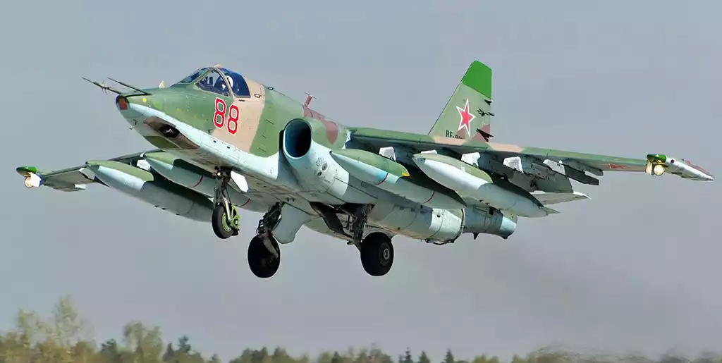 Le Su-25, est un avion à réaction bimoteur subsonique équipé d’un canon de 30 mm GSh-30-2 et d’une capacité d’emport de plus de 4 tonnes de munitions. Introduit au sein des forces soviétiques en 1981, sa production est arrêtée depuis 2010 en Géorgie et depuis 2017 en Russie.